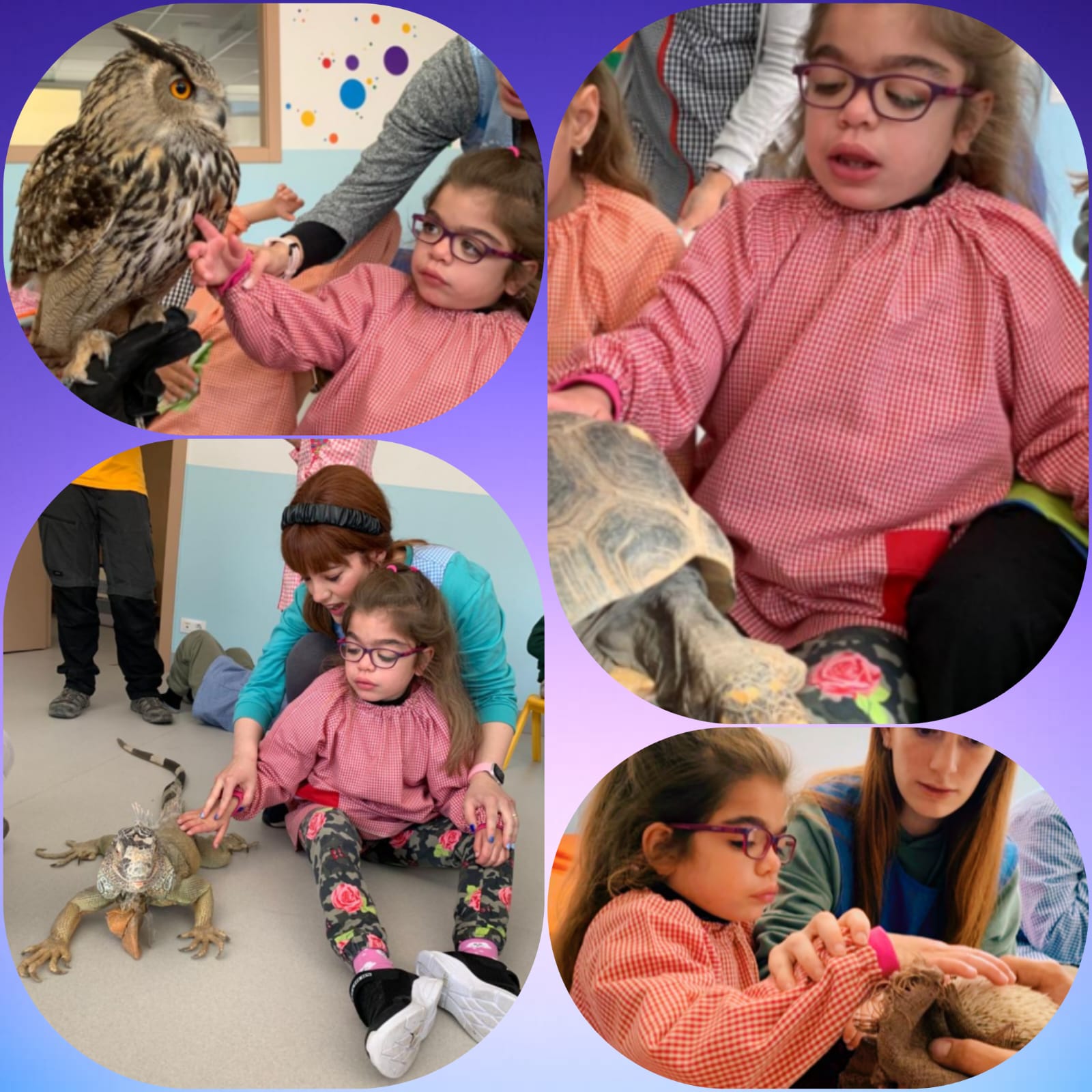 Vam poder tocar: Un mussol, una tortuga, un ànec, dues gallines, un conill, una serp, un eriçó i una iguana!
